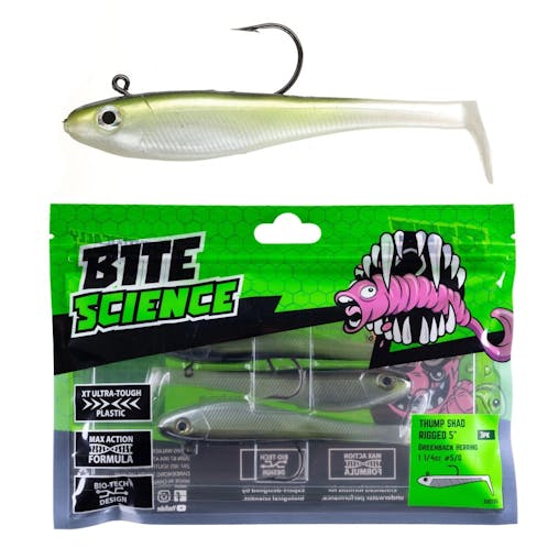 3 Pack of 5 Inch Bite Science Thump Shad Rigged Soft Plastics -Greenback Herring