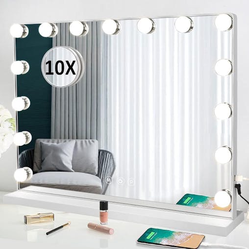 LED Vanity Mirror with Lights, USB Touch Control, 15 Dimmable Bulbs, 3 Color Modes, 10x Magnifying Mirror (White)