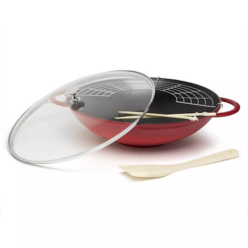 Staub Enamelled 37cm Cast Iron Wok w/ Rack Insert & Glass Lid Red