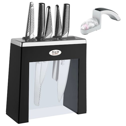 Global Kabuto Black 7Pc & Bonus Sharpener Knife Block Set Japanese Knives